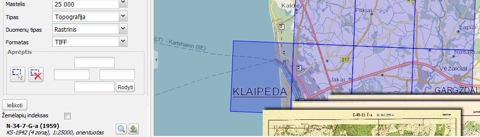 • GKMF erdvinių duomenų rinkinių paieška pagal žemėlapių: tipą, koordinačių sistemą, mastelį, orientavimą, viešumą, duomenų tipą, formatą, leidybos metus;