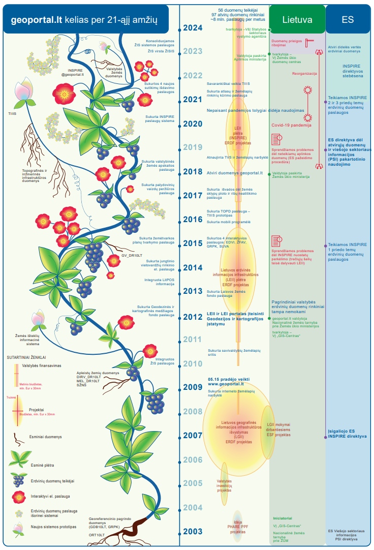 Plakatas, atspindintis Lietuvos erdvinės informacijos portalo raidą nuo 2003 iki 2024 metų. Alegorinio pobūdžio schemoje simboliais pavaizduoti pagrindiniai erdvinių duomenų rinkiniai, jų teikėjai, interaktyvios el. paslaugos, informacinių sistemų prototipai ir šių komponentų sąsajos.