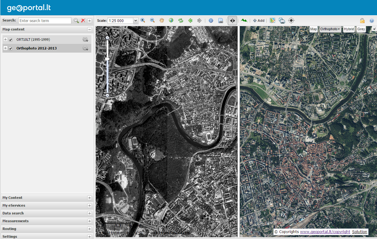 Map browser - is the environment used for work with maps and the most popular portal system. Here you cannot only view data, but also search for data sets and places on maps based on place names, use thematic catalogues of spatial data services where services are grouped according to their popular fi elds of application. The map browser has measurement, comparison, embedded map link creation, and various statistics calculation tools; you can compile, save and print your own maps in a format of your choice; you can also download these maps and spatial data. For your convenience, we are developing new tools which will enable easy use of data without any special software.